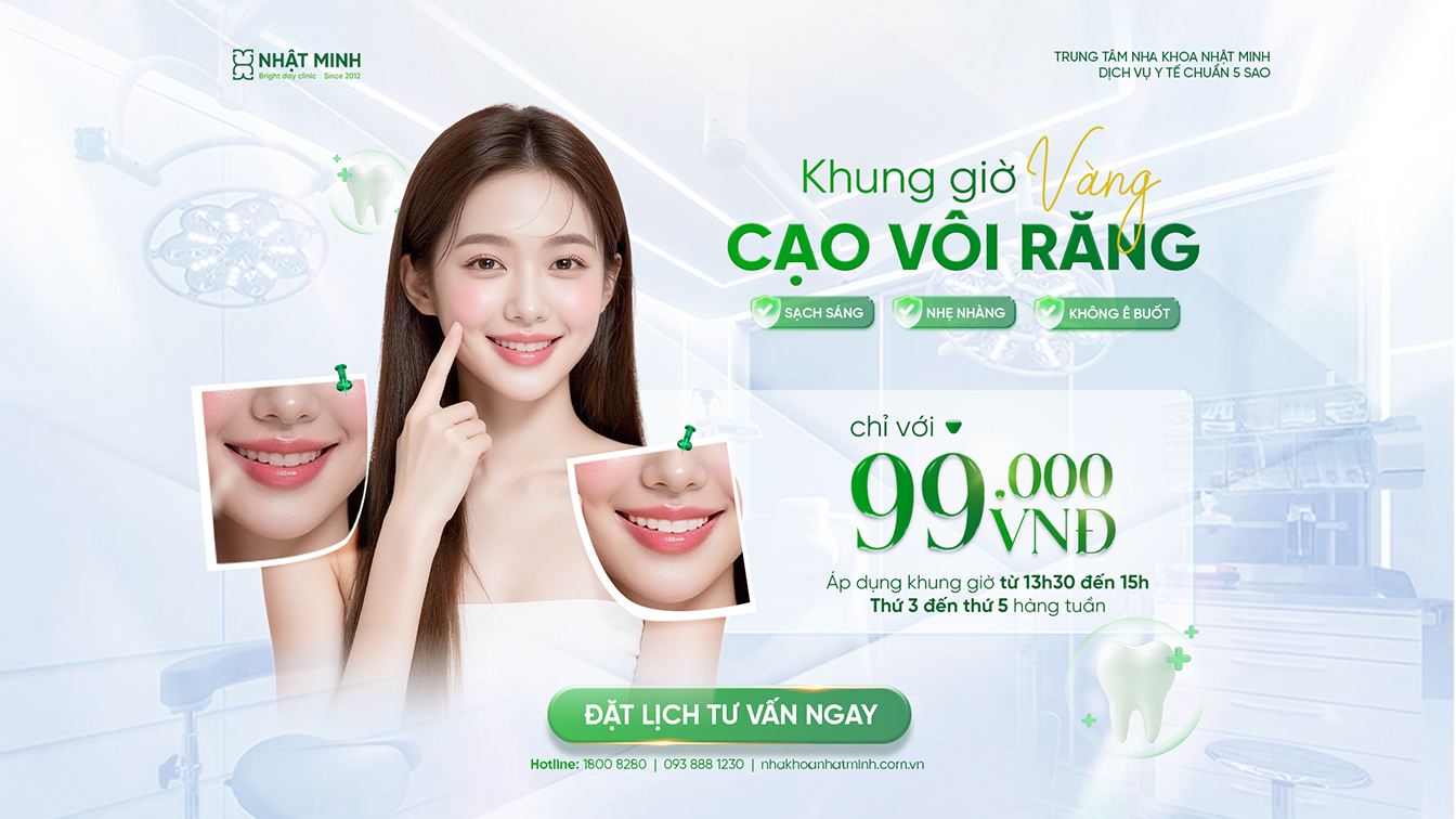 Thấu hiểu tâm lý “ngại nha khoa” của rất nhiều người – đặc biệt là ngại về chi phí, Nha khoa Nhật Minh quyết định triển khai chương trình ưu đãi đặc biệt cuối năm: Cạo vôi răng – đánh bóng chỉ 99.000 đồng. Chương trình áp dụng cho khách hàng check-in tại phòng khám từ 13h30 đến 15h các ngày thứ 3 đến thứ 5 hàng tuần, đến hết tháng 12 này. Đây không chỉ là cơ hội để mọi người trải nghiệm dịch vụ y tế chuyên nghiệp với giá ưu đãi, mà còn là cách Nhật Minh đồng hành cùng cộng đồng bảo vệ sức khỏe răng miệng lâu dài.