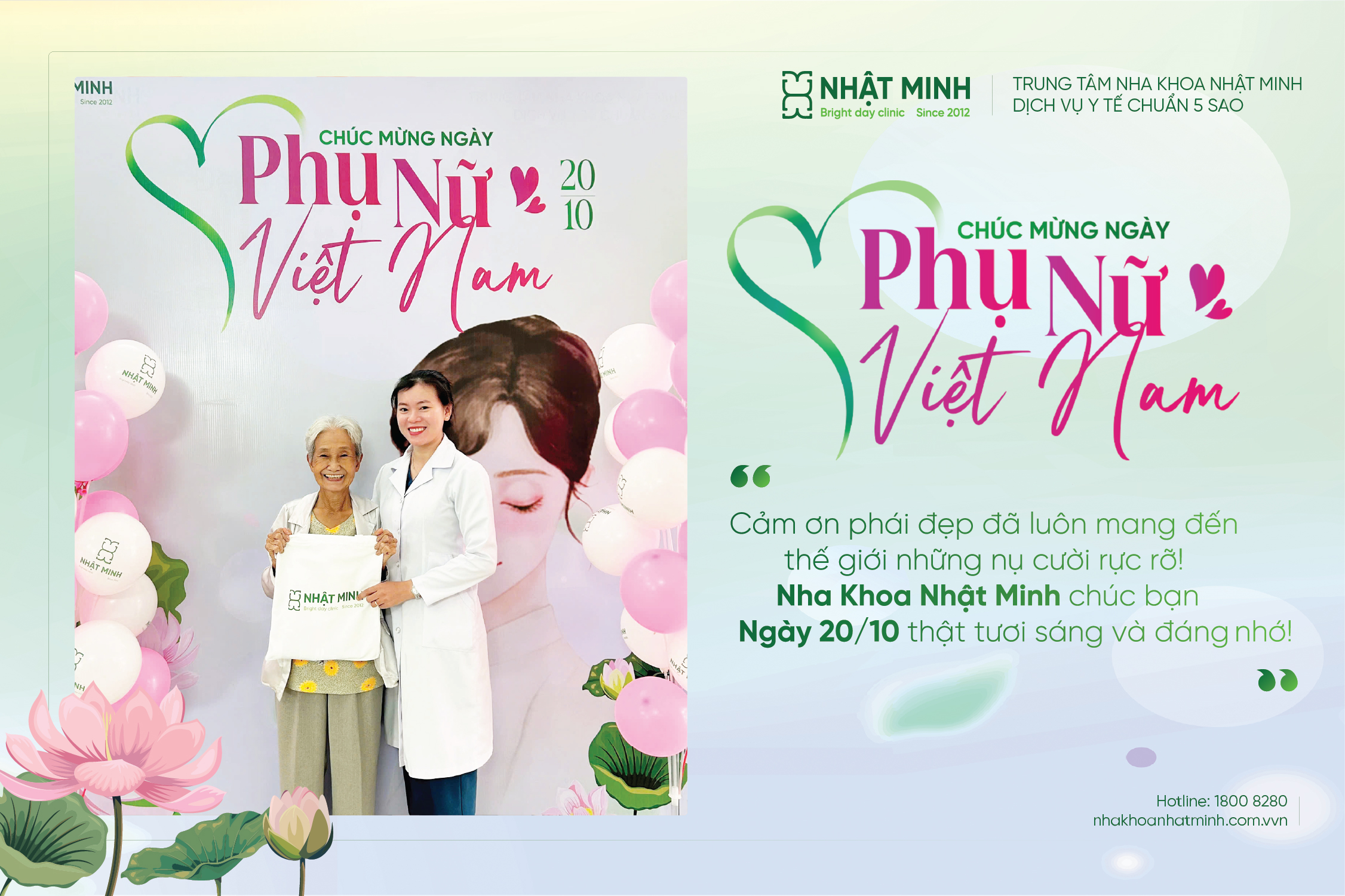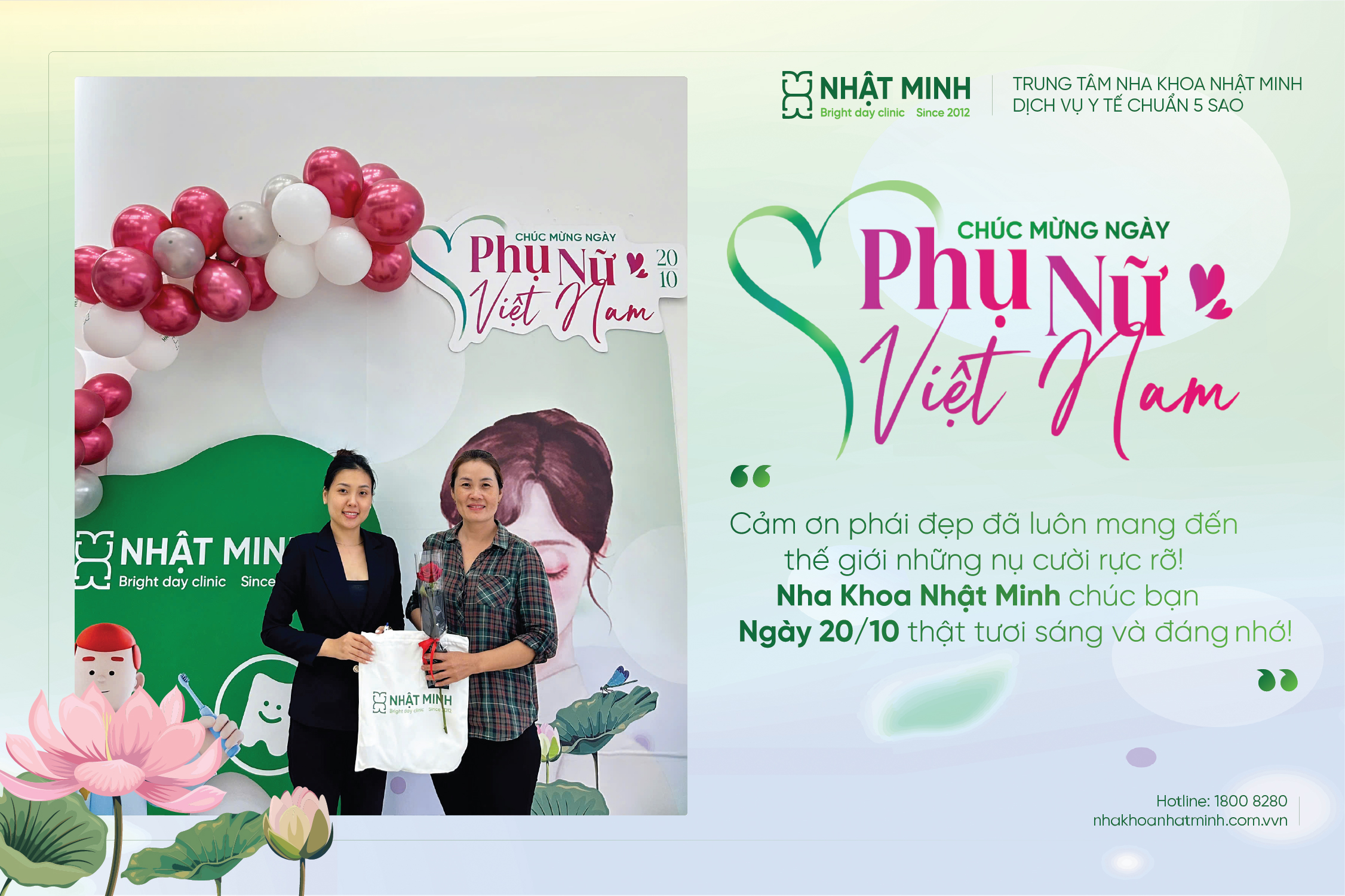Mỗi độ tháng Mười về, không khí tại Nha khoa Nhật Minh lại trở nên rộn ràng và ấm áp hơn bao giờ hết. Đây không chỉ là dịp để tôn vinh những người phụ nữ Việt Nam xinh đẹp, dịu dàng mà còn là cơ hội để đội ngũ Nhật Minh gửi gắm những lời tri ân chân thành nhất đến khách hàng những người đã đồng hành và tin tưởng suốt thời gian qua.