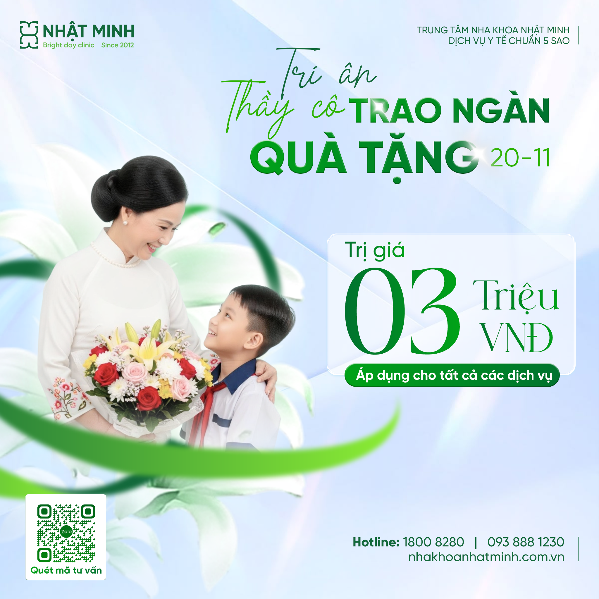 Nhân dịp kỷ niệm Ngày Nhà Giáo Việt Nam 20/11, Nha khoa Nhật Minh trân trọng gửi đến lời cảm ơn sâu sắc đến các Thầy Cô giáo - Những “người lái đò” tận tụy, âm thầm cống hiến cả tuổi xuân cho sự nghiệp trồng người. Để tôn vinh những đóng góp không mệt mỏi ấy Nha khoa Nhật Minh mang đến chương trình ưu đãi đặc biệt cho dịch vụ tẩy trắng răng, kèm theo đó là phần quà tặng tri ân trị giá lên đến 3.000.000đ. Đây không chỉ là món quà vật chất, mà còn là cách chúng tôi gửi gắm sự biết ơn chân thành, mong muốn cùng thầy cô kiến tạo những nụ cười rạng rỡ, tự tin và khỏe mạnh trên hành trình phía trước.