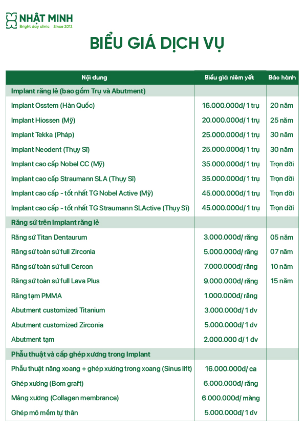 4. Chi phí các dòng trụ Implant tại Nha Khoa Nhật Minh Bến Tre