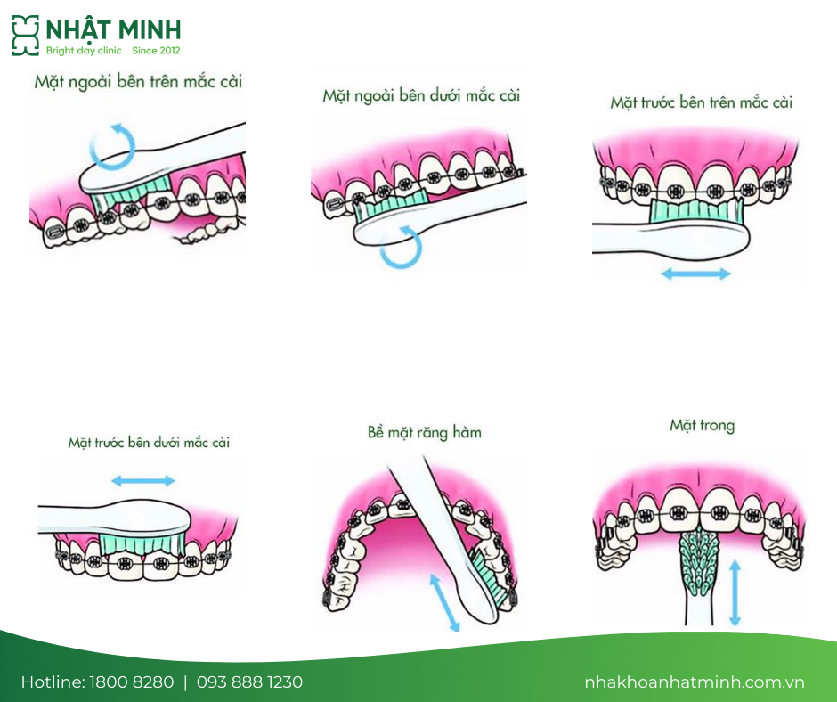 Khi chải, cần làm sạch lần lượt mặt trước, mặt sau và mặt nhai của răng. Đối với vùng mắc cài, nên chú ý chải nhẹ nhàng phía trên và phía dưới mắc cài để loại bỏ mảng bám tích tụ quanh dây cung. Thời gian chải răng nên kéo dài đủ lâu để đảm bảo khoang miệng được làm sạch toàn diện.