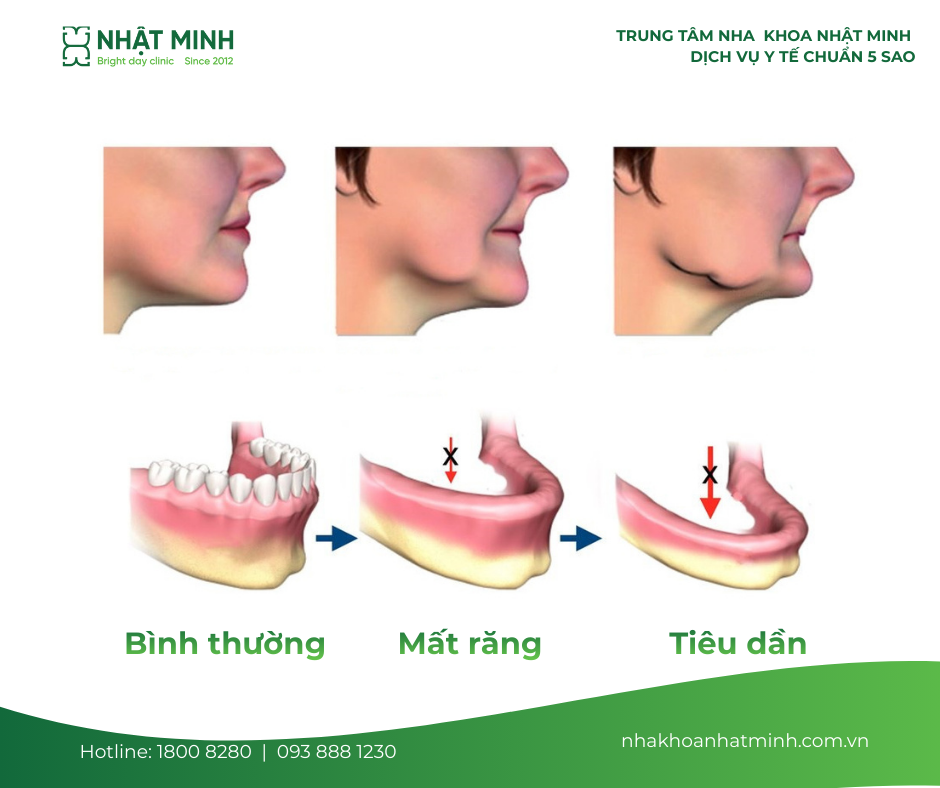 Một hậu quả nghiêm trọng khác của mất răng hàm là tiêu xương hàm. Khi răng bị mất, chân răng không còn kích thích xương hàm thông qua lực nhai sinh lý. Theo thời gian, xương tại vị trí đó sẽ dần tiêu biến cả về chiều cao lẫn chiều rộng. Điều này không chỉ làm nướu bị tụt mà còn khiến vùng má bị hóp, khuôn mặt mất cân đối và xuất hiện dấu hiệu lão hóa sớm.