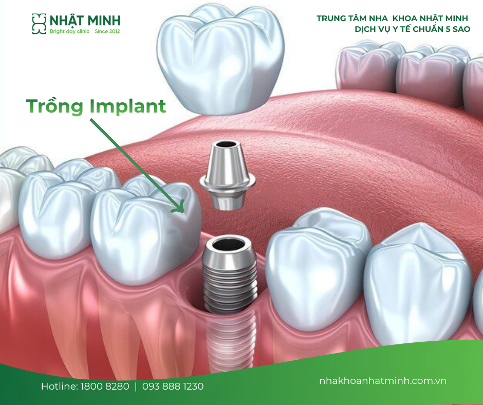 Trồng răng Implant là phương pháp phục hình răng mất hiện đại trong nha khoa hiện nay. Kỹ thuật này sử dụng trụ Implant làm từ Titanium cấy trực tiếp vào xương hàm tại vị trí mất răng để thay thế cho chân răng thật. Sau khi trụ tích hợp ổn định với xương, bác sĩ sẽ gắn mão răng sứ lên trên thông qua khớp nối Abutment để tạo thành một chiếc răng hoàn chỉnh.