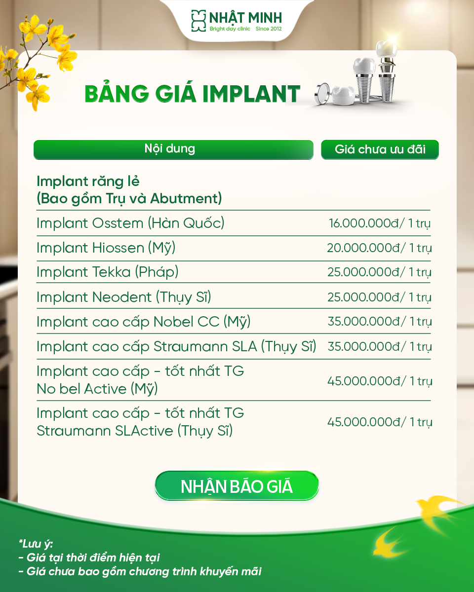 Bảng giá trồng răng Implant tại Nha Khoa Nhật Minh được xây dựng theo từng loại trụ Implant và mão răng sứ đi kèm. Chi phí trọn gói, minh bạch, phù hợp với nhiều nhu cầu phục hình răng mất.