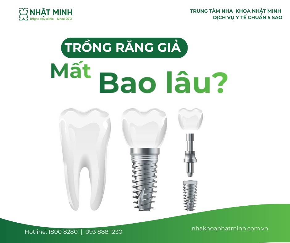 Thời gian trồng răng giả sẽ khác nhau tùy phương pháp. Hàm tháo lắp và cầu răng sứ thường hoàn tất trong vài ngày. Với trồng răng Implant, cần thêm thời gian để trụ tích hợp xương trước khi lắp răng sứ cố định, tổng thời gian có thể kéo dài vài tháng.