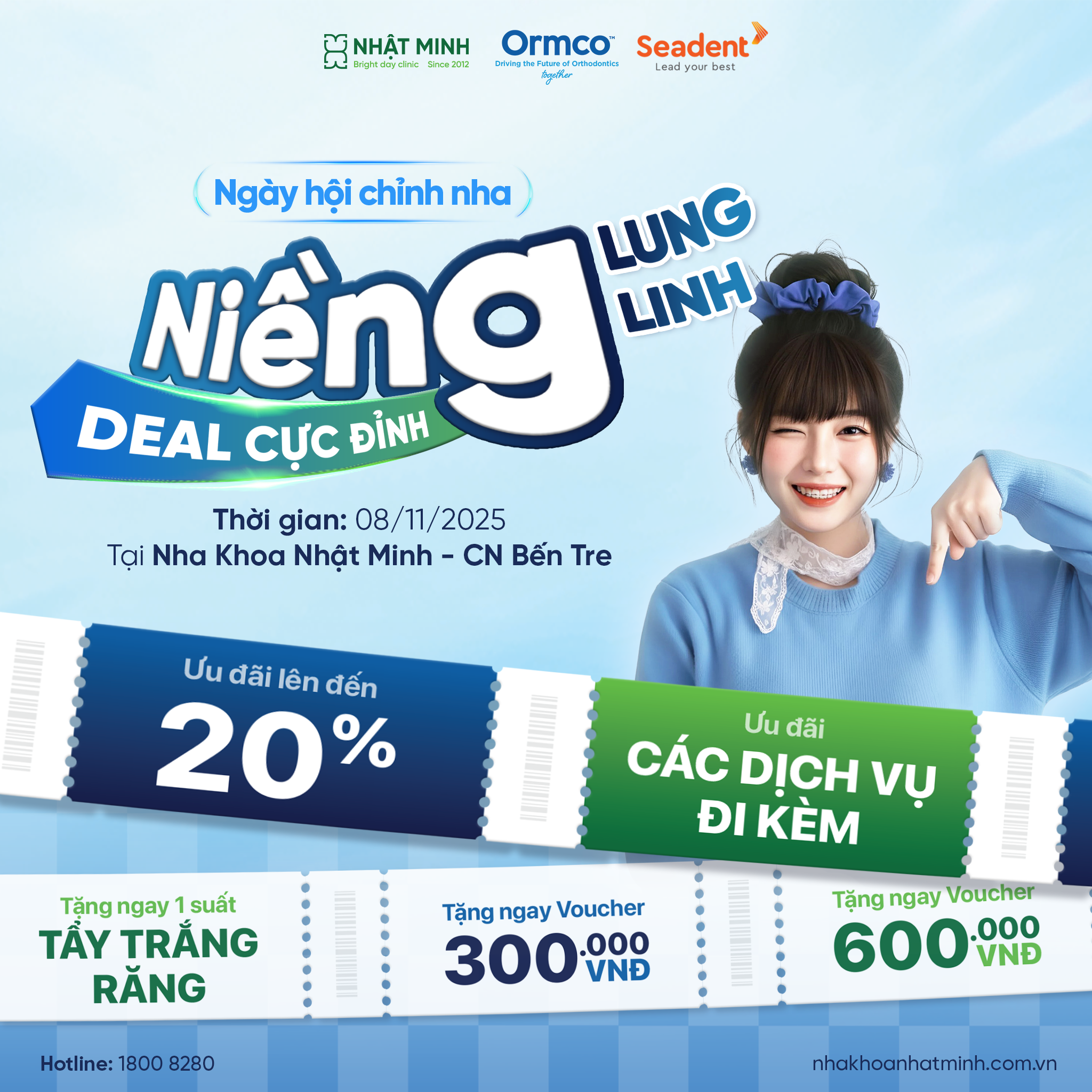 Diễn ra vào ngày: 8/11/2025 tại Bến Tre. Mang lại cơ hội tư vấn niềng răng, chỉnh nha miễn phí, nhận ngay những phần quà hấp dẫn, Voucher khi tham gia chương trình và được kiến thức chuyên môn từ các chuyên gia đầu ngành.